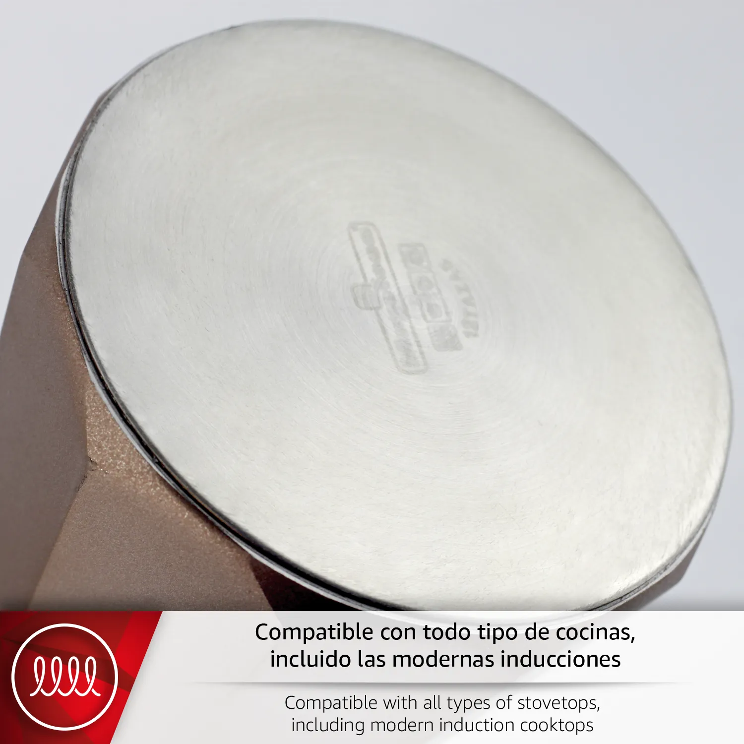 ALUMINIO EXTRA GRUESO: Es un componente muy ligero, excelente conductor térmico y eléctrico lo que redunda en ahorro de tiempo y energía. El calor se reparte de forma uniforme en toda la superficie. Apta para cocinas eléctricas, gas, vitroceramica e INDUCCIÓN.