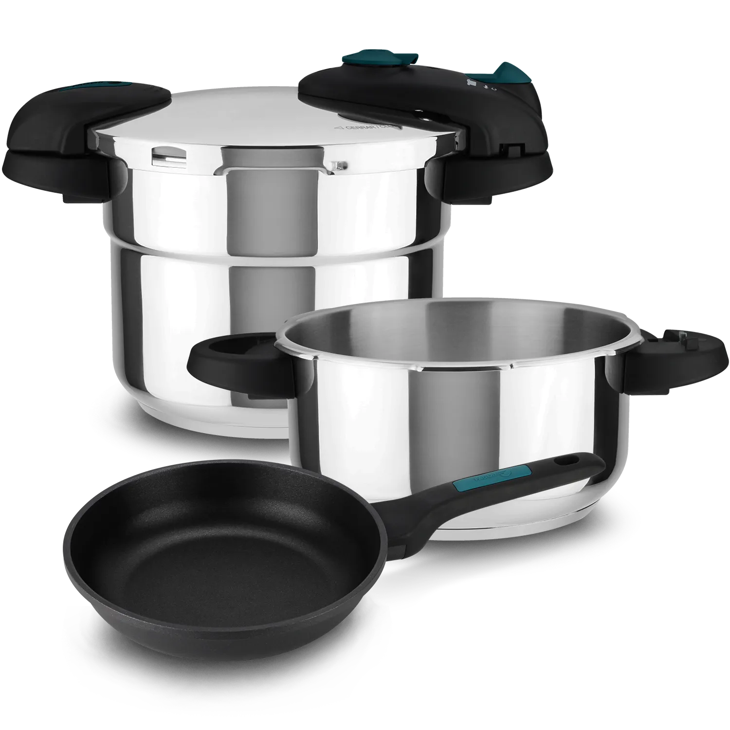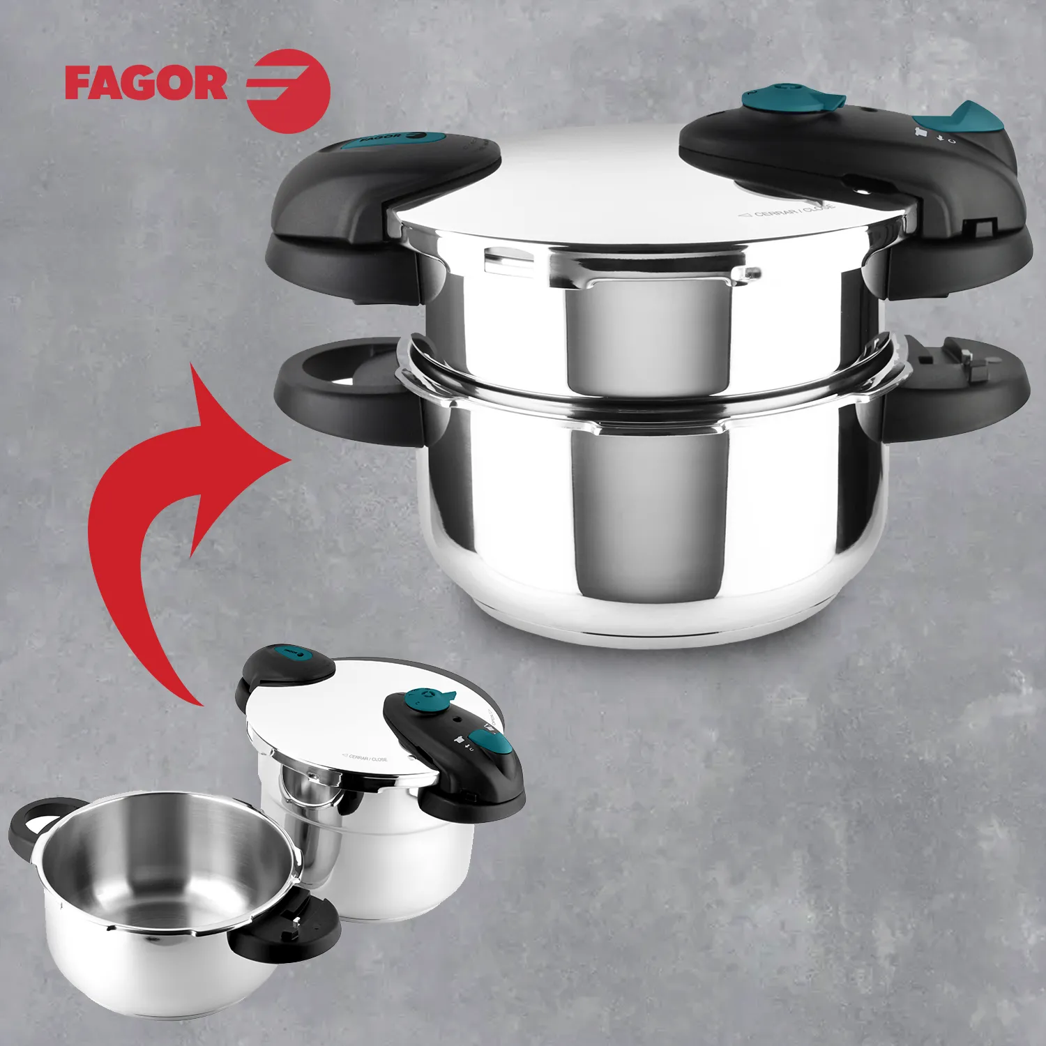 Pack FAGOR FUTURE: Ollas a presión de 4 y 6 L y sartén de 20 cm para cocinar rápido, sano y sin esfuerzo. Conserva hasta el 80 % de nutrientes y reduce los tiempos de cocción hasta un 70 %. Ollas express fabricadas en acero inoxidable 18/10 y sartén de 20 cm de aluminio fundido con antiadherente Xylan Plus. Seguras, resistentes y compatibles con gas, vitro, eléctrica e inducción. Ideal para cualquier receta diaria.