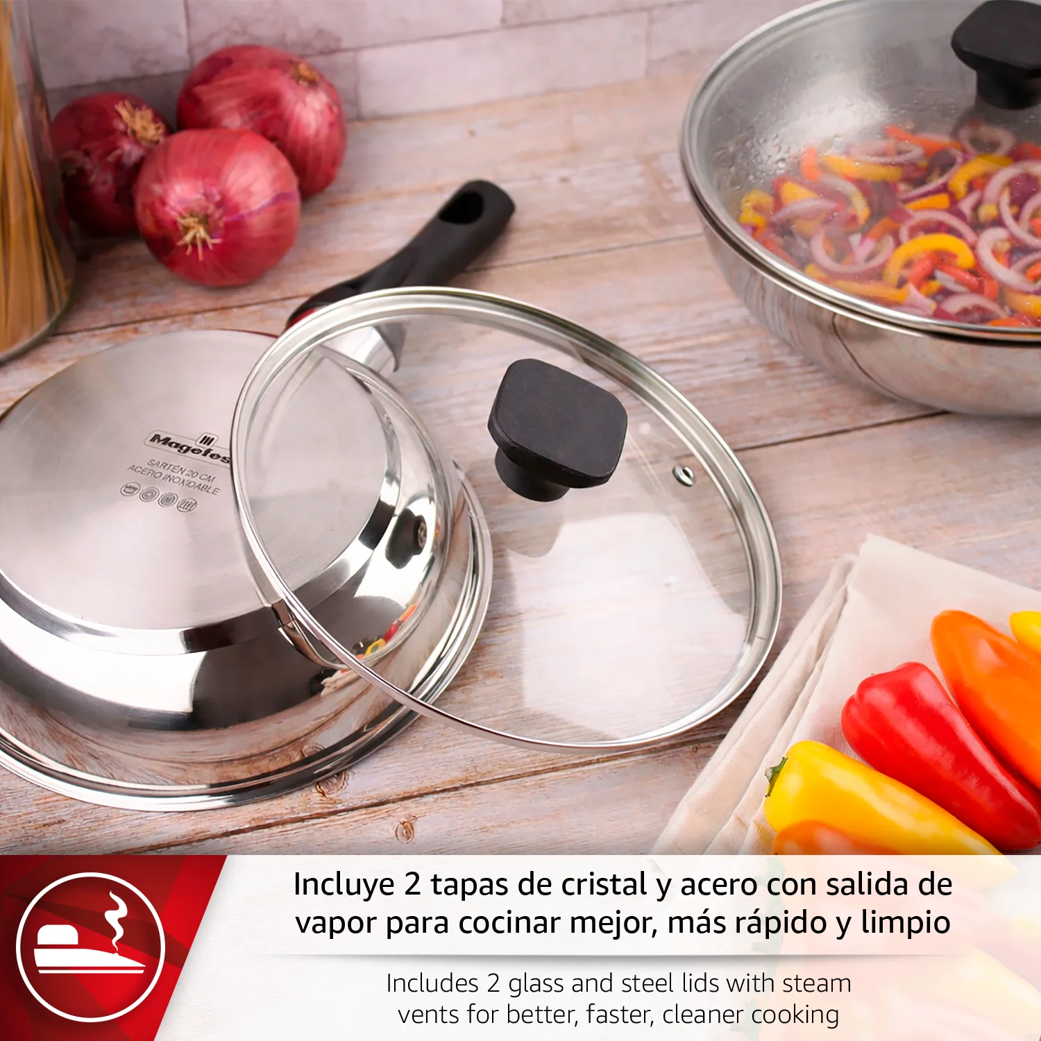 El JUEGO DE SARTENES con tapa MAGEFESA SANTE incluye dos tamaños (20 y 26 CM), ideales para cocinar todo tipo de recetas con máxima comodidad. Fabricadas en ACERO INOXIDABLE resistente y LIBRES DE BPA, PTFE y metales pesados, garantizan una cocina más saludable. Compatibles con GAS, INDUCCIÓN, VITROCERÁMICA y ELÉCTRICAS, ofrecen un reparto uniforme del calor y un mango ergonómico para un manejo seguro y práctico cada día.