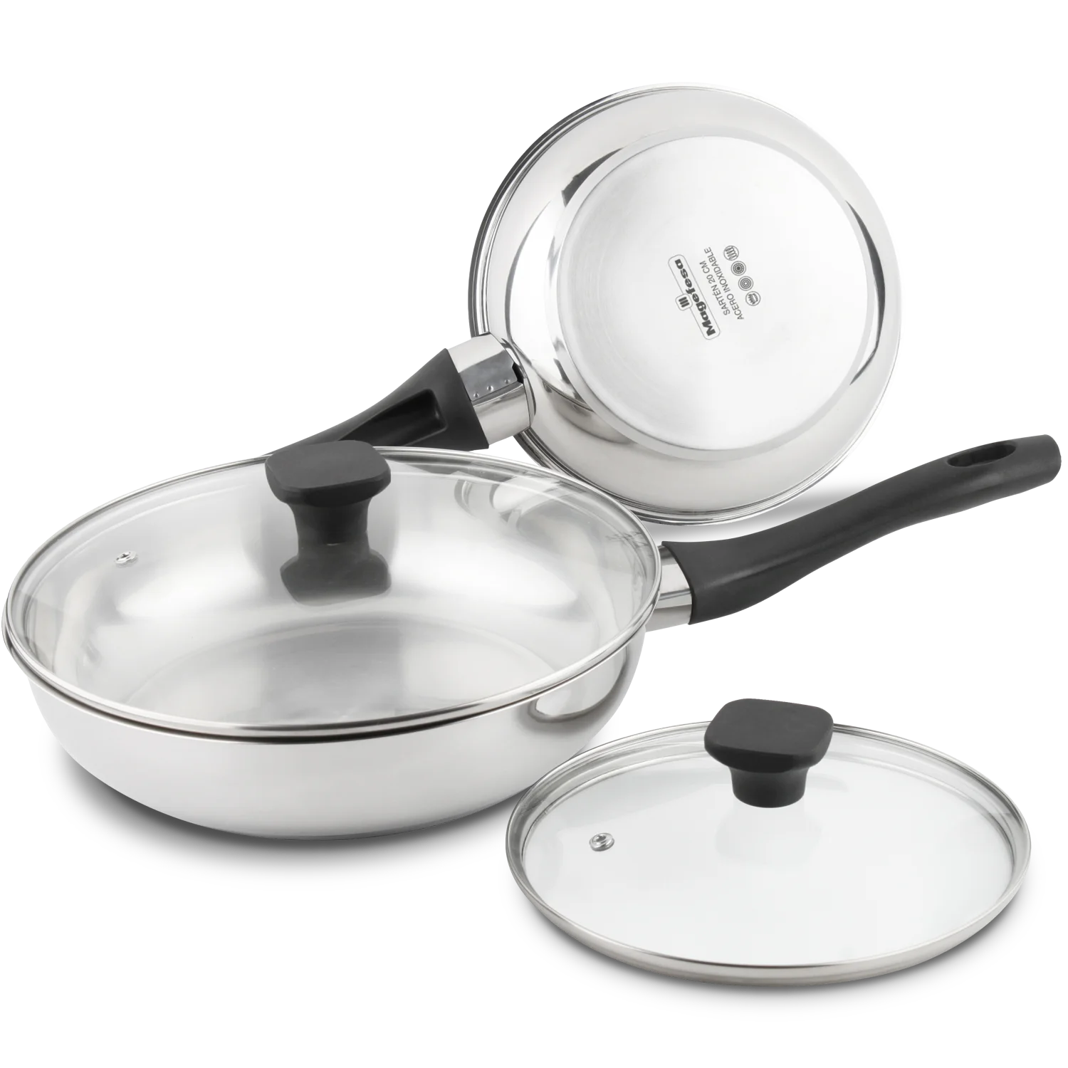 Magefesa Sante – Juego de Sartenes 20 + 26 cm + 2 Tapas de Cristal Termo Resistente, Acero Inoxidable, Sin Antiadherente, Compatible con Inducción