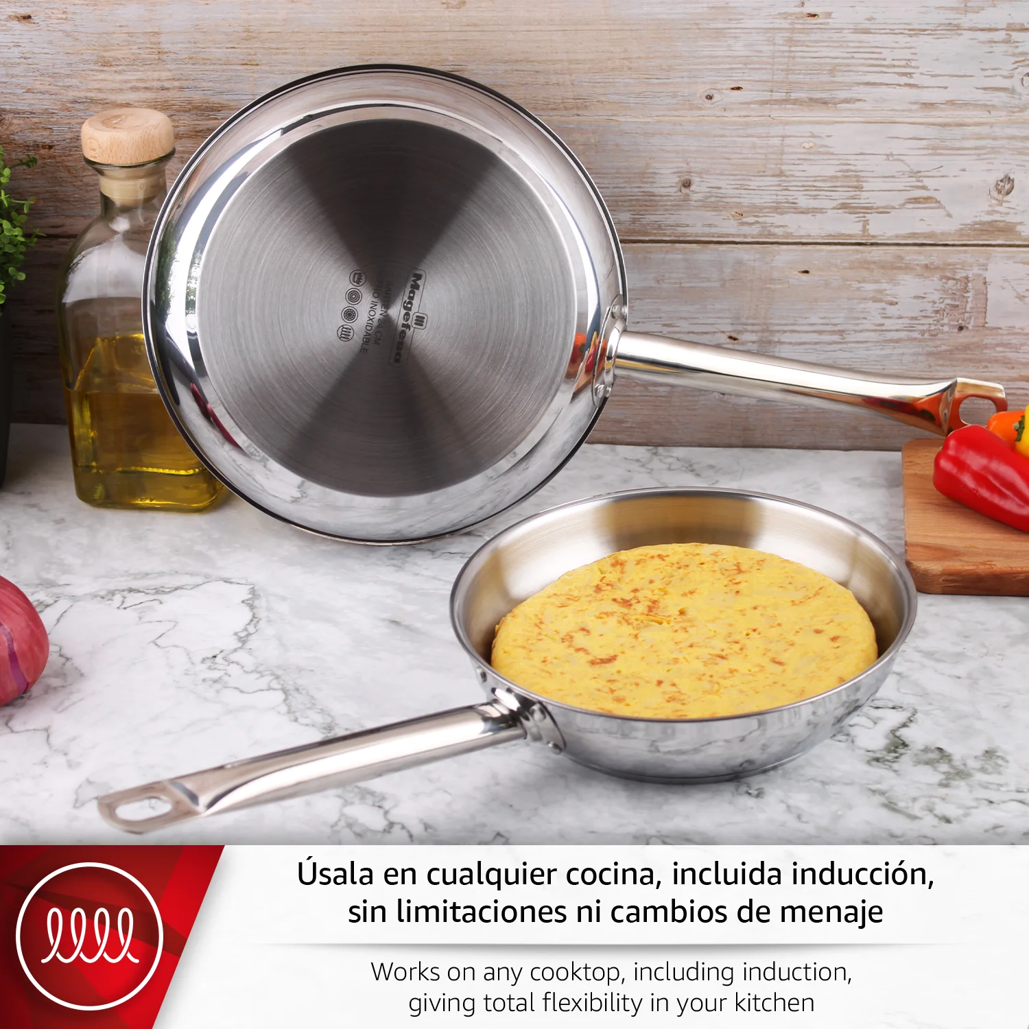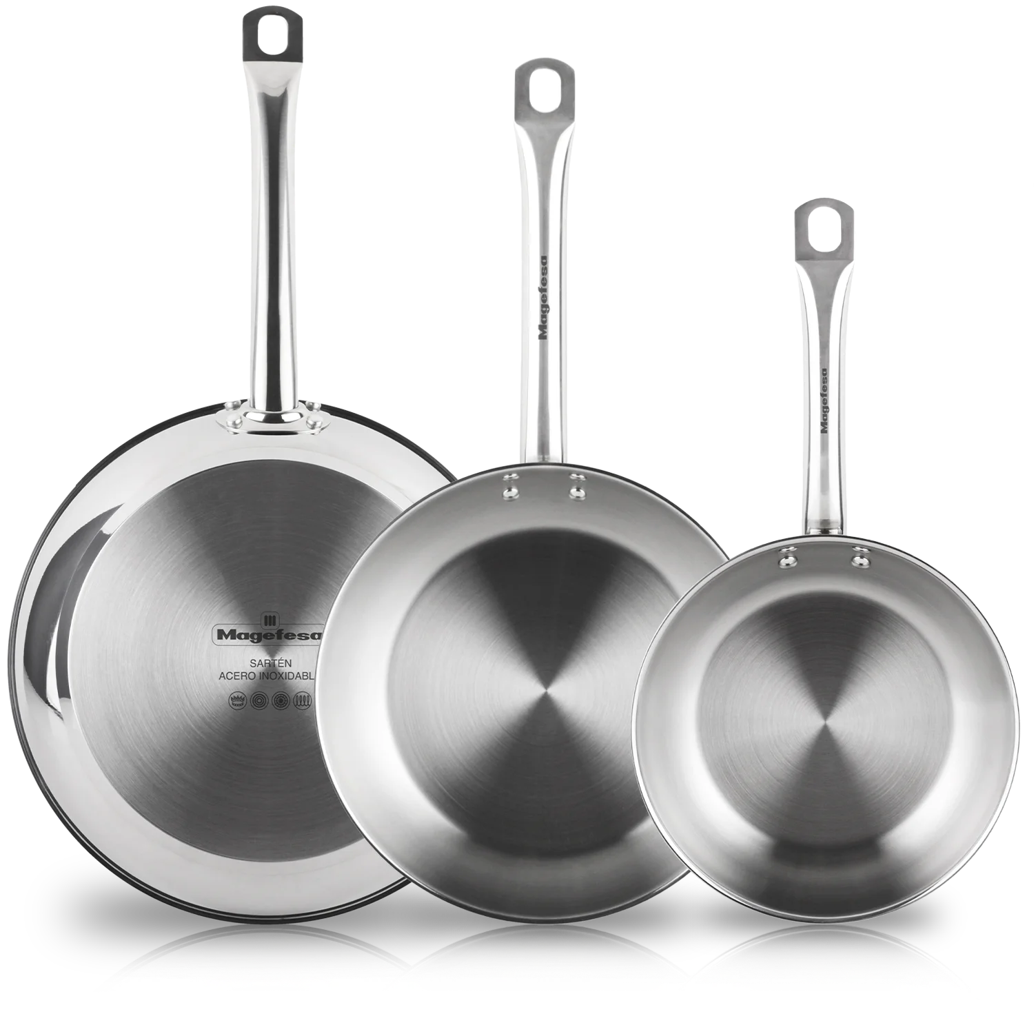 Juego de sartenes sin antiadherente MAGEFESA ECOSTEEL fabricada en ACERO INOXIDABLE de alta resistencia, diseñada para un uso intensivo sin deformarse y con ÓPTIMA DISTRIBUCIÓN DEL CALOR. Apta para todo tipo de cocinas, incluida INDUCCIÓN, y para horno hasta 220 °C. Su MANGO DE ACERO ofrece agarre firme y seguro. Cocina de forma más saludable, sin antiadherentes ni PFOA/PTFE, con fácil limpieza incluso en lavavajillas.