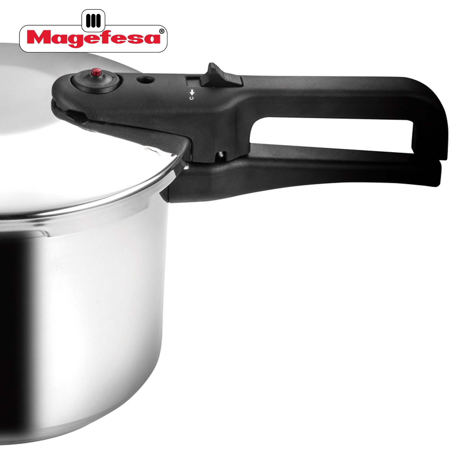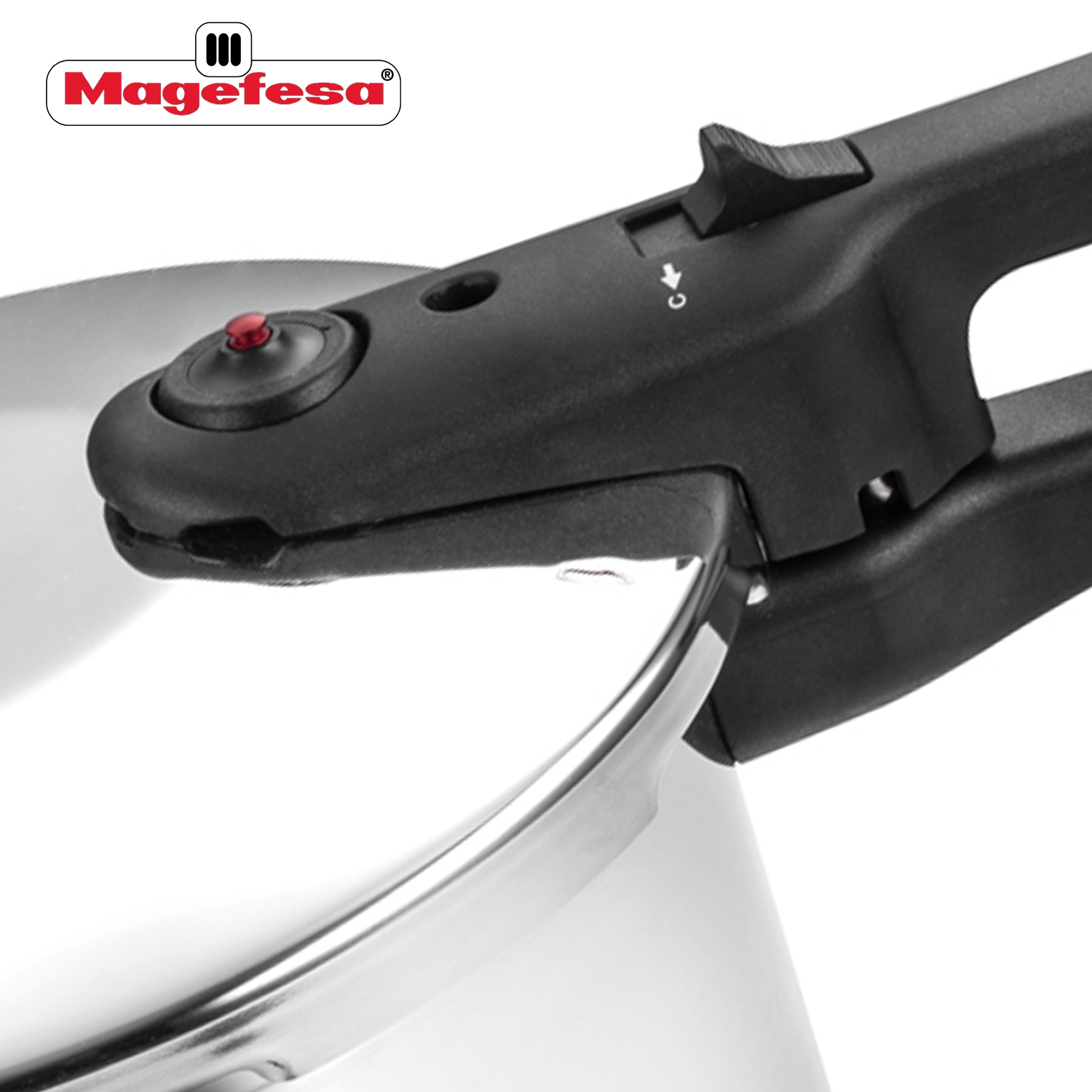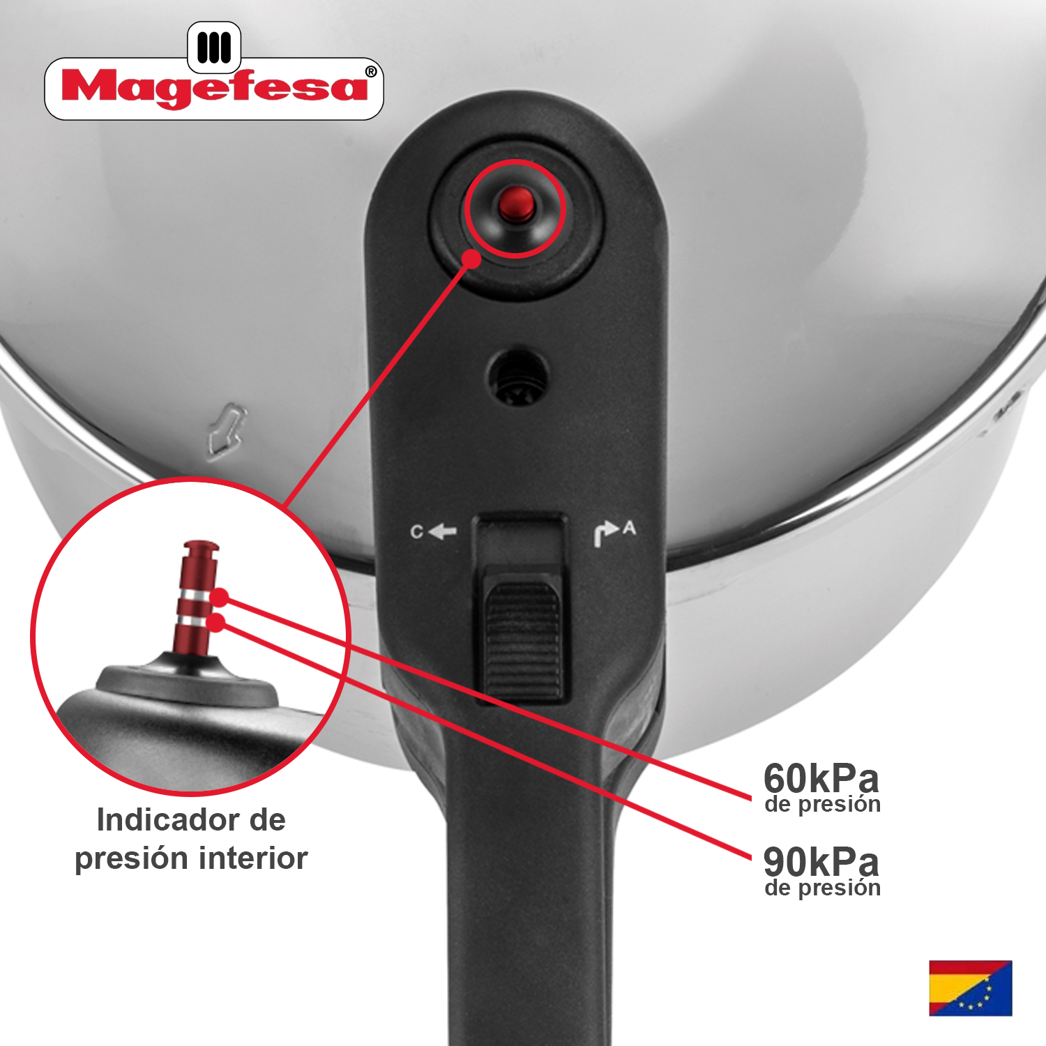 Súper Rápida: la olla a presión MAGEFESA MAGESTAR ofrece una cocción súper rápida con un funcionamiento muy simple y un sistema de apertura patentado para cerrar la tapa con el mínimo esfuerzo y máxima seguridad. Además gracias a su INDICADOR DE PRESIÓN podrá saber en todo momento la presión interior por su desplazamiento vertical (60kPa y 90 kPa). Las Asas laterales son termo-resistentes aseguran un manejo cómodo y seguro.