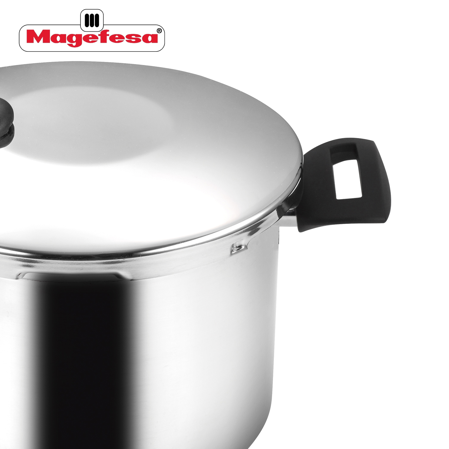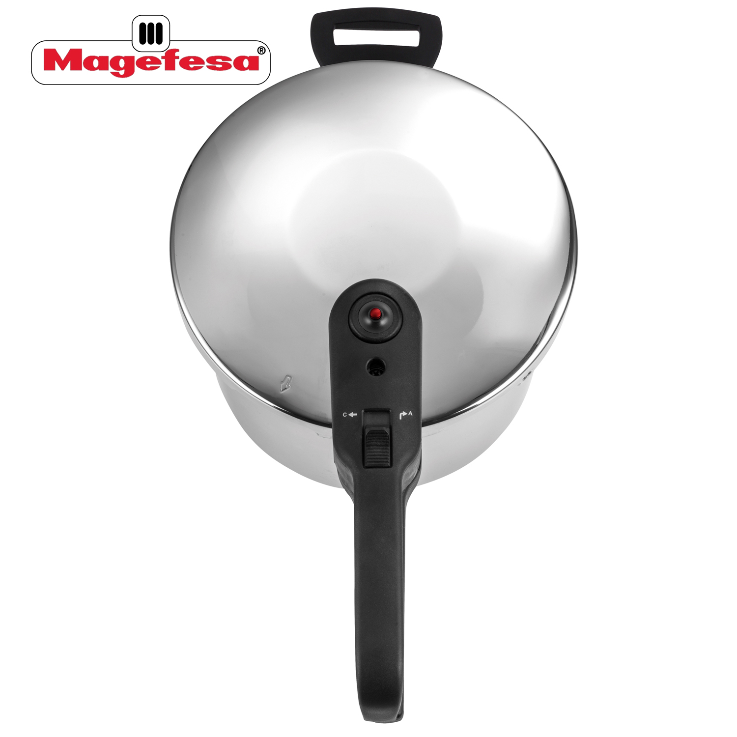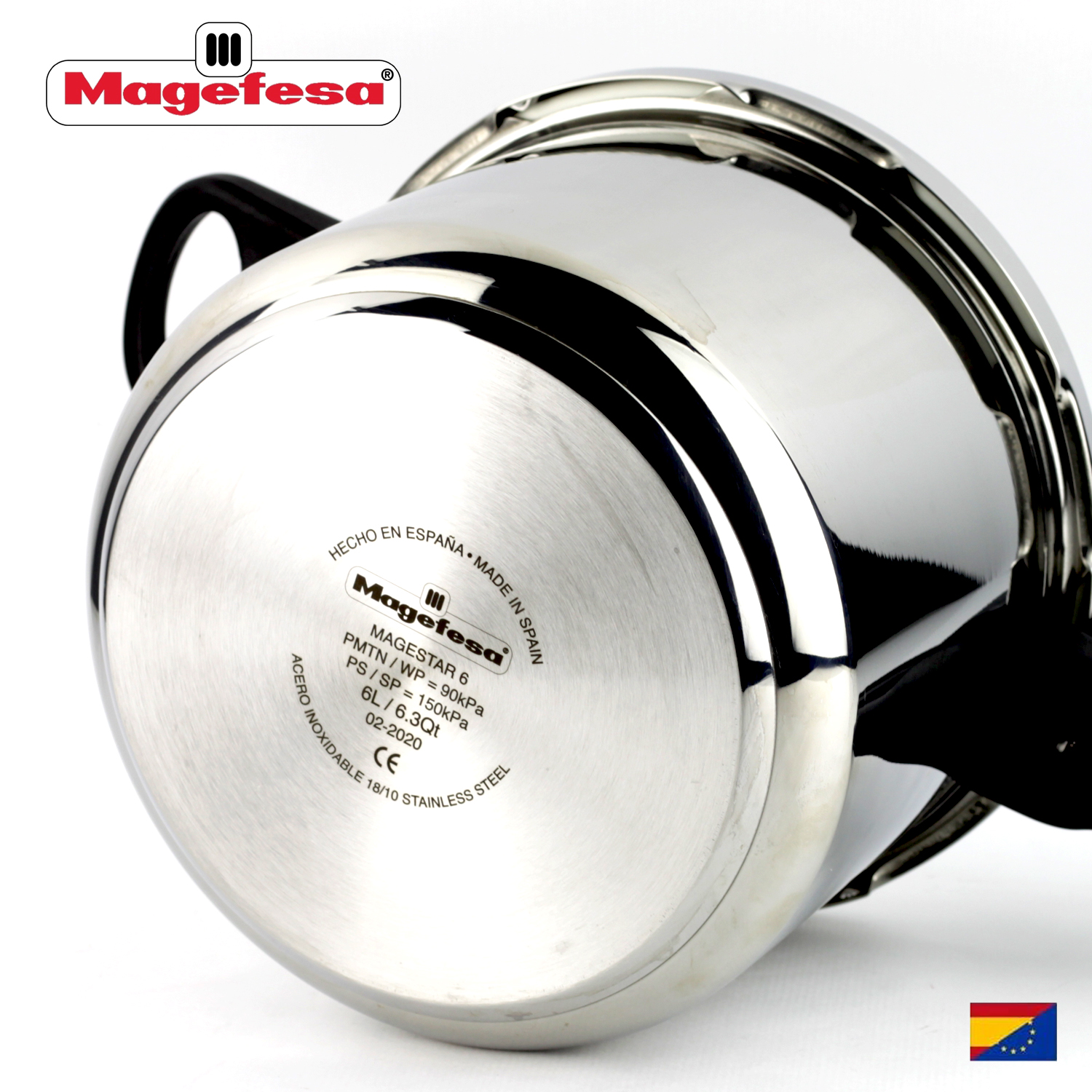 Súper Rápida: la olla a presión MAGEFESA MAGESTAR ofrece una cocción súper rápida con un funcionamiento muy simple y un sistema de apertura patentado para cerrar la tapa con el mínimo esfuerzo y máxima seguridad. Además gracias a su INDICADOR DE PRESIÓN podrá saber en todo momento la presión interior por su desplazamiento vertical (60kPa y 90 kPa). Las Asas laterales son termo-resistentes aseguran un manejo cómodo y seguro.