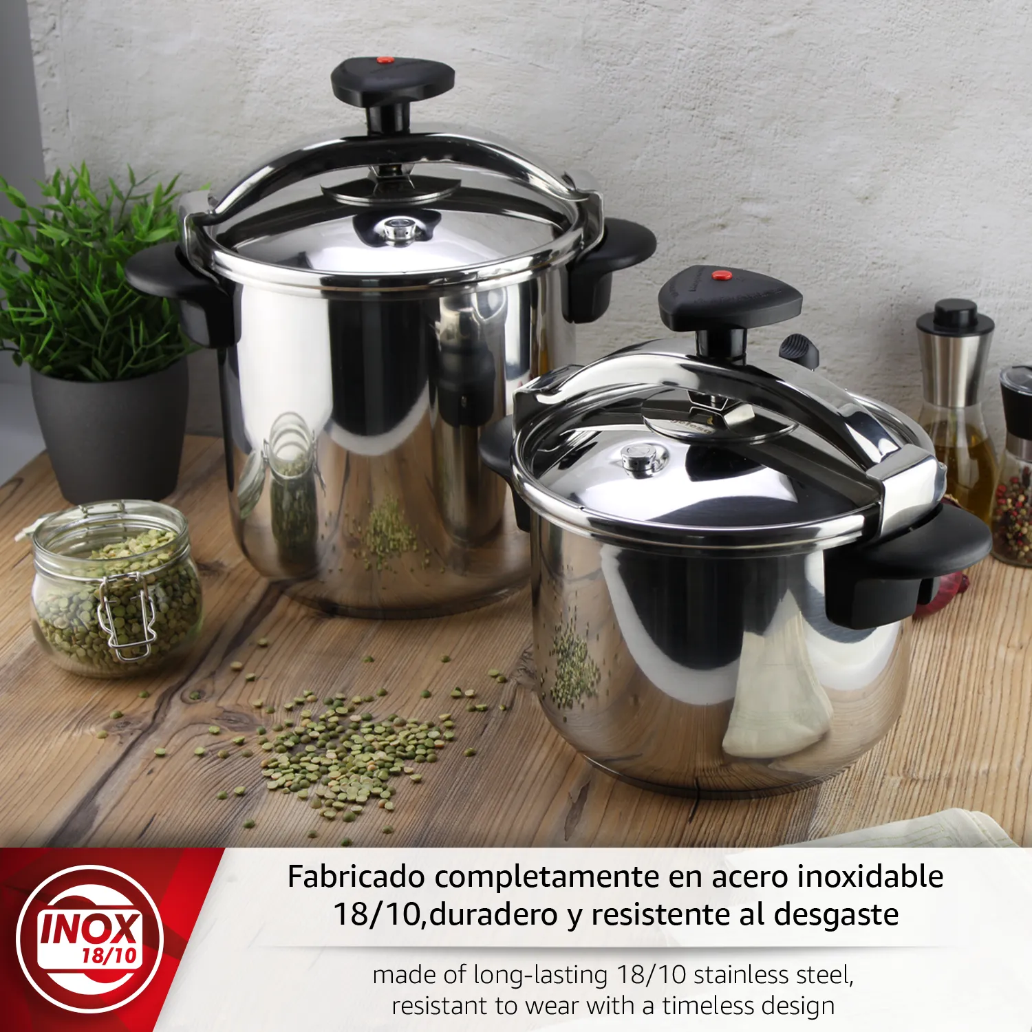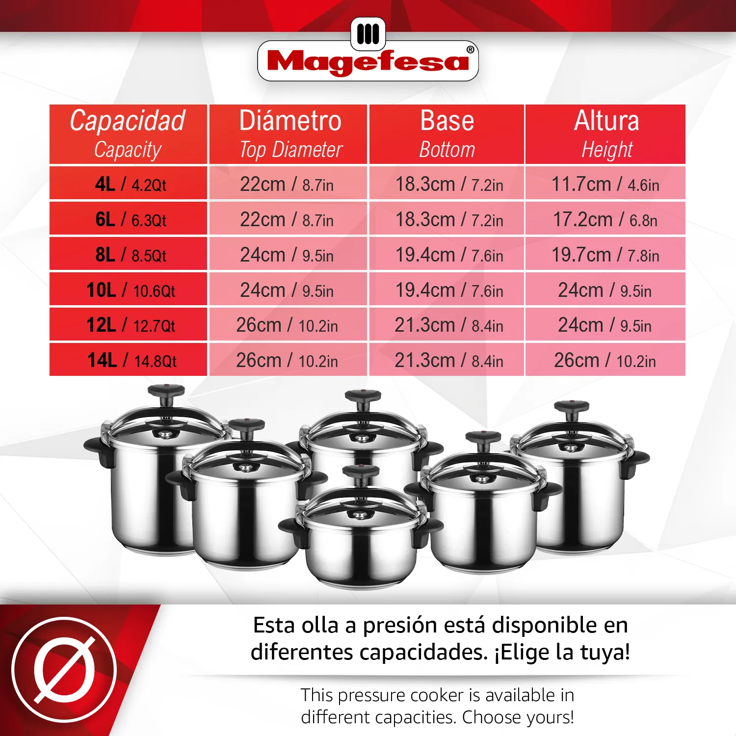 Materiales Duraderos: La olla Express MAGEFESA STAR está fabricada en acero inoxidable 18/10 de gran resistencia al desgaste, con un diseño recto y elegante. Su tapa robusta sella herméticamente para mantener intactos sabores y nutrientes, garantizando comidas más sanas y llenas de sabor para toda la familia.