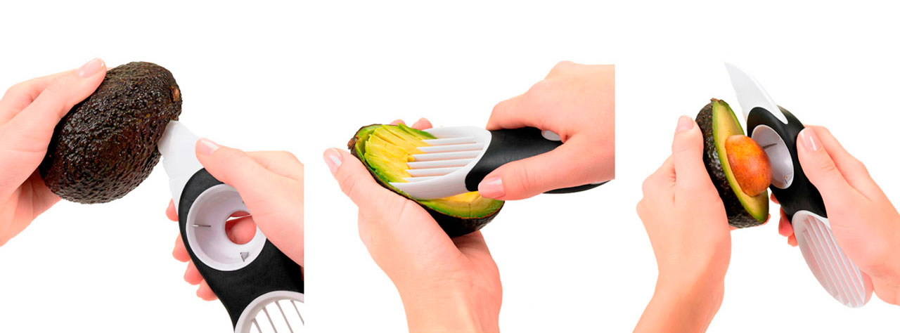 (En estas imágenes, el pelador cortador de aguacates en plena acción. Pela, lamina al tiempo que vacia el interior, y también retira el hueso)