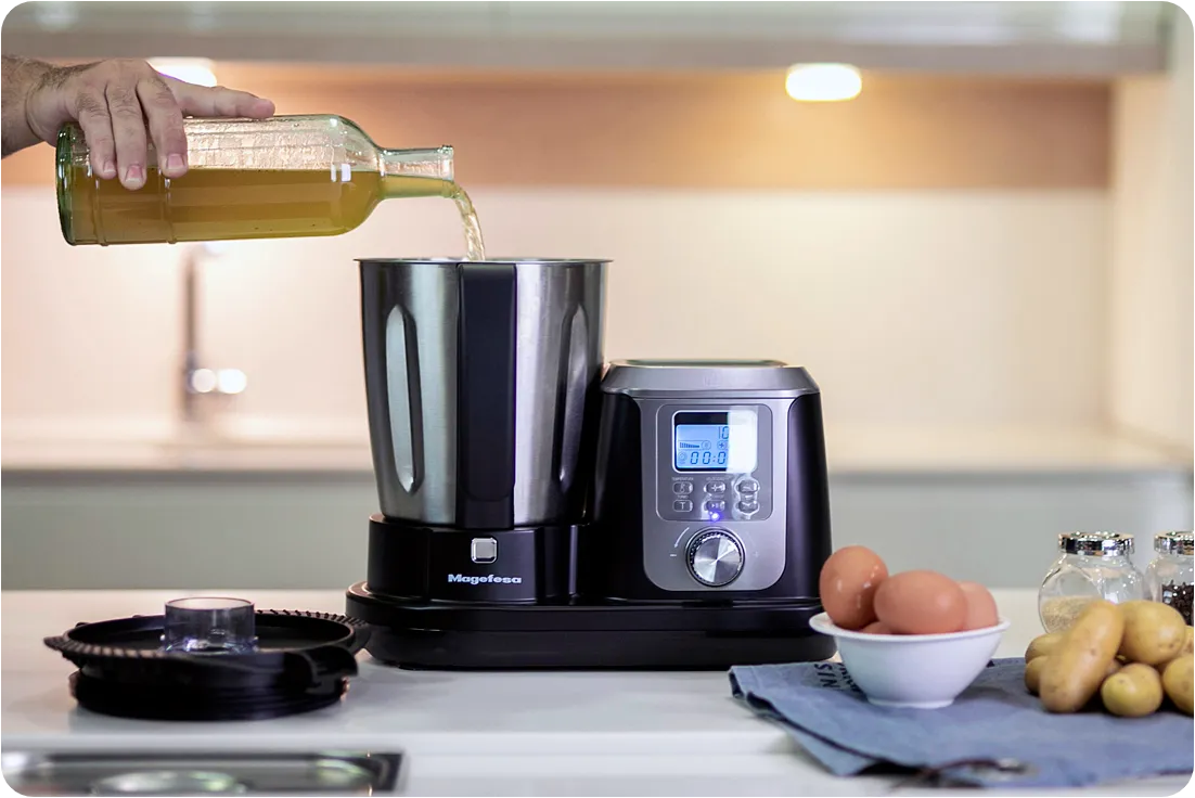 Innovación: El robot de cocina MAGEFESA Magchef es un dispositivo multifuncional que combina varias funciones en un solo aparato, haciendo que cocinar sea más fácil y rápido con sus programas automáticos y su intuitiva pantalla táctil.
