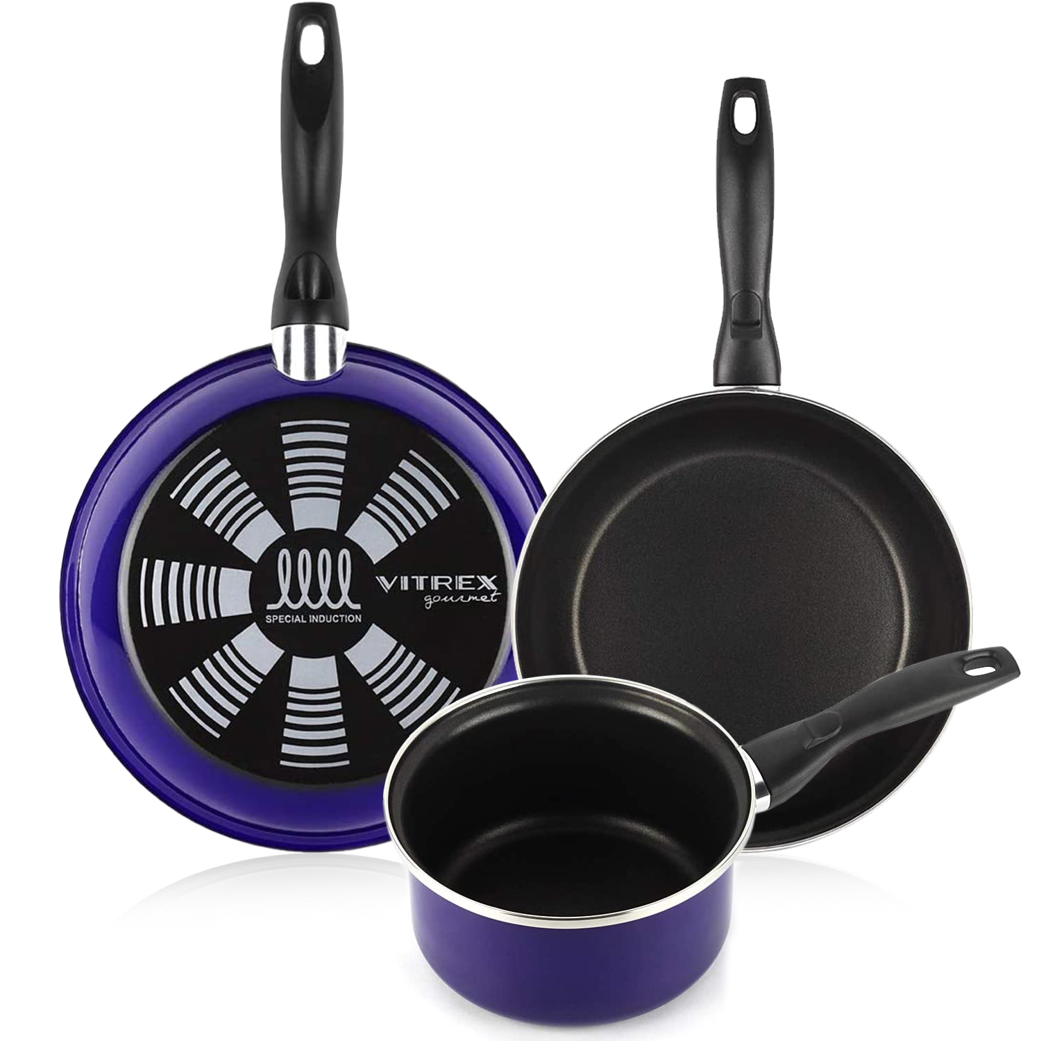 VITREX ® Marseille set de sartenes azules 24 + 28 cm y cazo de 16 cm, antiadherente doble capa, acero vitrificado, compatible con todo tipo de fuego, incluido inducción, mango ergonómico, sartén, cazo